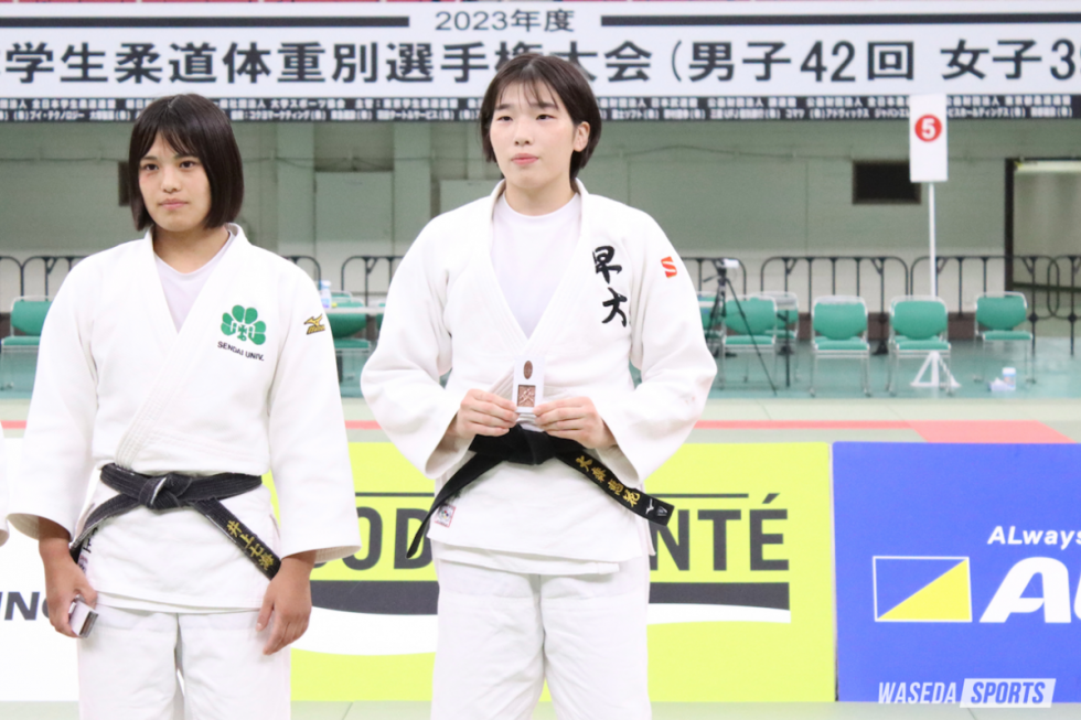 渡邉と同じく70キロ級で出場した大森は、初戦を袈裟固、続く2回戦を大内刈による一本勝ちで突破し、準々決勝へと駒を進める。準々決勝では互いに足技の掛け合いが続く中、開始から約1分半後に大外刈で技ありを奪った大森。その後、足技でバランスを崩した相手を仰向けに返し、上四方固で合わせ技一本勝ちを収めた。迎えた準決勝は、後に優勝を果たした龍谷大の溝口葵(3年)と対戦。試合は大森が果敢に大内刈などを仕掛け、先に相手が2つの指導を受ける。大森に有利な展開かと思われたが、本戦終了間際で体勢を崩したところを寝技に持ち込まれ、後袈裟固により一本負け。決勝進出とはならなかったが、3位に入って昨年に続く講道館杯への切符を手にした。