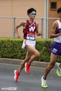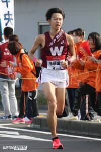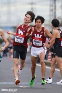 4区は、春先からトラックで好タイムを連発のルーキー、工藤慎作(スポ1=千葉・八千代松蔭)が起用された。小刻みなアップダウンがあり攻略が難しいといわれる4区のコースを難なくこなし、残り1キロで前を走る國學院大学との差を4秒にまで縮める。前方では熾烈(しれつ)な3位争いが繰り広げられていたが、6位から順位を上げることはできず、5区にタスキを渡した。そのタスキを受け取ったのは間瀬田純平(スポ2=佐賀・鳥栖工)。前後にランナーが見えず、風の影響を受けやすい単独走となった。タスキを受けた時は「前との差を詰めることだけを考えていた」という間瀬田。2キロ過ぎからは夏合宿中から気にしていたという胃の痛みに見舞われ、思うようにペースを上げられない。しかし、その差を広げられることは無く区間5位の安定した走りでレースを終えた。アンカーにはロードを得意としている安定感抜群のルーキー、長屋匡起(スポ1=長野・佐久長聖)が起用された。序盤はなかなかペースを上げられず、1位との差を30秒ほど広げてしまうが、残り3キロ地点では前の青学大の姿をはっきりと捉え、最後まで粘りの走りを見せる。惜しくも順位を上げることはできず、6位でフィニッシュとなった。