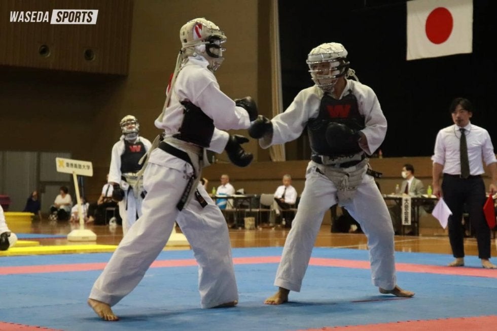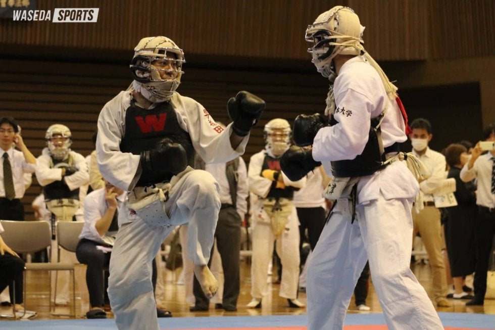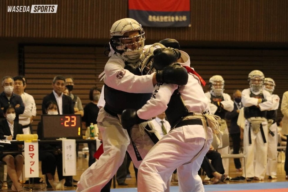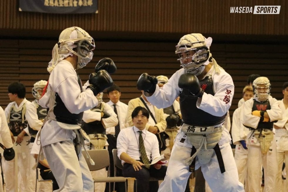 男子は1大学7人の団体戦となる今大会。初戦は日大との対戦となった。次鋒・金田空大副将(教3=大阪・明星)がわずか14秒で決着を付けるなど、終始危なげない戦いを見せる。7ー0で完勝を収め、準決勝に駒を進めた。準決勝は全国大学選抜選手権で敗れた中大との一戦。リベンジを期す対戦となったが、先鋒・駒形佳大(文4=埼玉・浦和)が開始5秒で一本を取られ中大のペースに。さらに投げ技から体勢を崩され、面突きを許してしまう。次鋒・能藤雅智(文3=東京・朋優学院)は積極的な攻めを見せるも、カウンターで面突きを立て続けに決められ敗戦。参鋒・押村星舟(政経4=東京・芝)も体格で上回る相手の投げ技に対応できず3連敗を喫した。0ー3と後がなくなった早大は中堅・西村が登場する。相手を抱え込む形で接近戦に持ち込むと、膝蹴りを胴に決めて一本を先取。幸先の良いスタートを切った西村だったが、その後は試合を決め切ることができない。すると残りおよそ30秒のところでカウンターから胴突きで一本を献上する。勝利が必要な西村はその後果敢に攻めを展開するも、そのまま引き分けた。参将・橋口翔平(人3=鹿児島中央)は抑え込みで一本を奪われるも、直後に胴蹴りを決めて1ー1に。その後は拮抗(きっこう)した展開となるが、胴蹴りで一本を取られ敗戦。副将・金田も一本は取るものの、勝利をつかむことはできない。大将・河口陽(教4=新潟第一)は残り1秒の場面で面突きを許し、6敗1分けで3位決定戦に臨むこととなった。