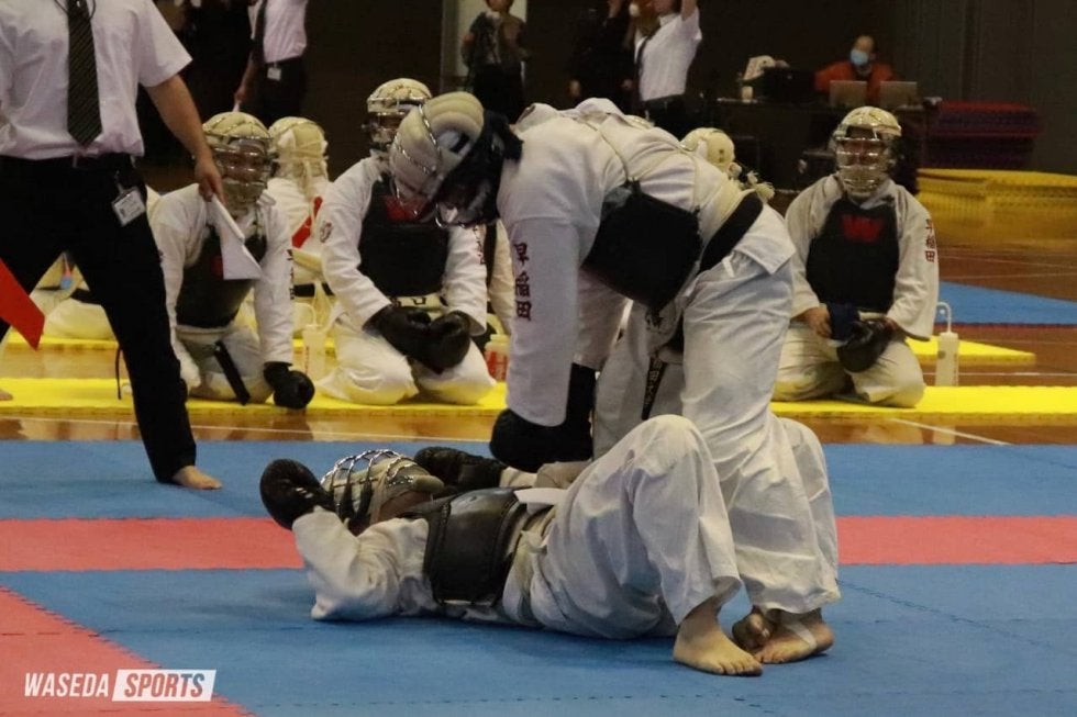3位決定戦の相手は慶大。先鋒・松崎滉生(法3=東京・早大学院)は開始16秒で胴突きから一本を奪う。さらに相手の足を取るとすかさず胴蹴りを決めた。次鋒・河口も相手の攻めに冷静に対処しながら鋭い突きを繰り出し快勝。先鋒、次鋒の2人が早大に勢いをもたらす。参鋒・松木義一(文3=東京・西)は敗戦を喫するも、駒形が慶大に流れを渡さない。投げの打ち合いで勝って馬乗りの形になると、そのまま押さえ込んで一本。しかし、その後は押さえ込みから一本を返される。それでも駒形は見事な投げを決めると、そのまま胴突きで勝利を収めた。参将・橋口は攻撃で常に先手を取り、相手に反撃の隙を与えない。鋭い面突きを連続で決め、この時点で早大の勝利が確定した。副将・能藤は敗れたものの、大将・西村は膠着(こうちゃく)した試合展開の中で面突きから一本を奪う。その後は後がない相手の攻撃を冷静にいなして試合終了。5勝2敗で早慶戦に勝利した。