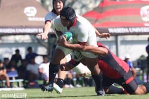 早大Bは前節、強敵である帝京大Bと対戦した。序盤に2トライを奪われるものの、その後は粘り強いディフェンスで相手を自陣に攻め込ませず、継続する攻撃で得点を重ねる。帝京大Bにワンチャンスから追加点を許したが、リズムをつかみながら12ー26で前半を折り返した。後半はディフェンスの精度がさらに上がり、勢いに乗った早大Bは、34分にWTB磯崎錬太郎(商4=徳島・城東)のトライで同点に追いついた。しかし、試合終了間際に突き放され、26ー40で悔しい敗戦となった。