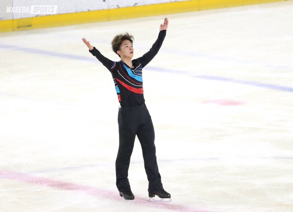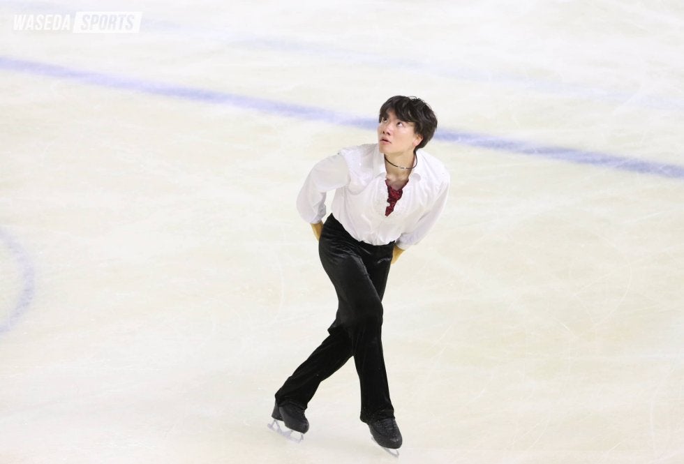 妻鹿愛(政経2=大阪桐蔭)も今回、初の東インカレ出場を果たした。全日本インカレへの出場権を得ること、そしてケガからの復帰段階にある中で、「できることを一つずつ精一杯やる」ことを目標に大会に臨んだ。仲間や観客からの声援を力に演技を始めた妻鹿は冒頭、3回転トーループに挑戦。回転不足の判定とはなったが、何度も「(演技構成に)絶対に入れたい」と話していたジャンプを着氷した。その後の2回転アクセルは2本とも1回転となり得点を重ねることができなかったが、後半は巻き返しを見せ、結果は全体8位。早大勢トップの成績を残した。目標としていた全日本インカレ出場を決め、「ケガに気をつけながら、(中略)自分の出せる100パーセントをかたちにして、表彰台などを狙っていきたい」と強く意気込む。