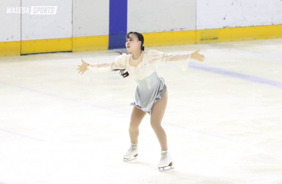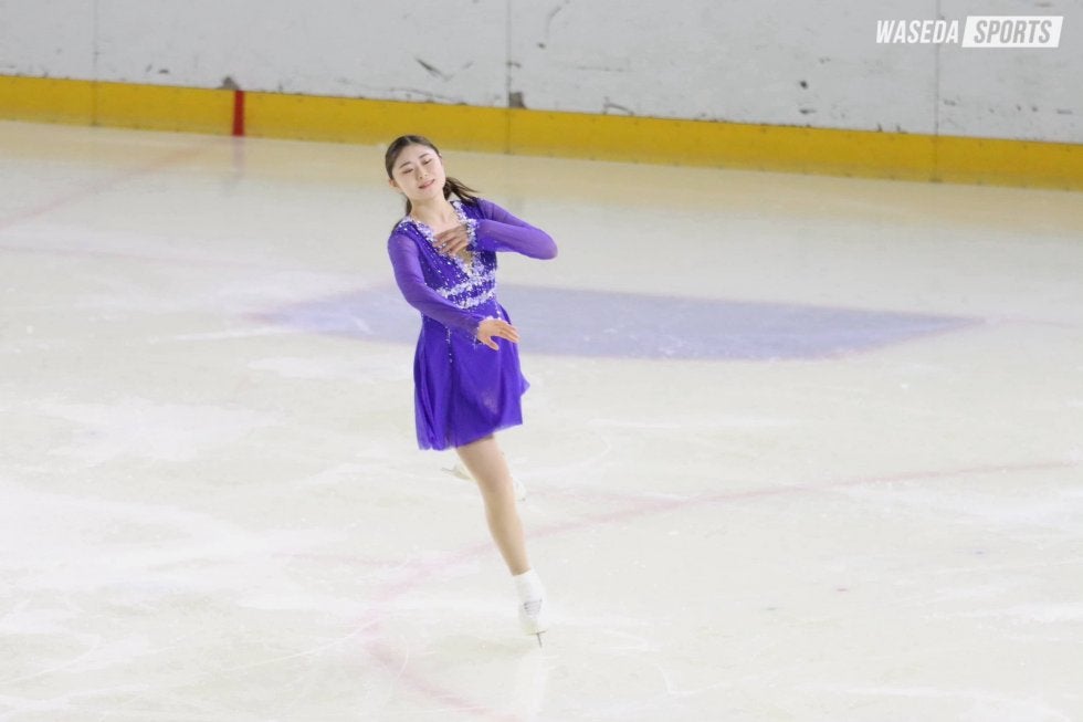 大会2日目には女子6級の競技が行われ、早大からは3人が出場した。トップバッターは23番滑走の栁田梨穂子(創理1=埼玉・川越女)。初めての東インカレ出場に、演技前は「ずっと心臓の音が聞こえるくらい緊張していた」という。それでも転倒なく演技をまとめ、本人も「久しぶりに大きなミスがなかった」と振り返る好演技を披露。冒頭の2回転アクセルをはじめ回転不足などのミスはあったものの、演技の全体の流れを途切れさせることなく『レ・ミゼラブル』の壮大な曲に乗って演技を行なった。得点は50・50点と、前戦から12点ほど点数を上げた。今大会での演技内容、点数を振り返って笑顔を見せた栁田だが、スケーティングスキルやスピード感の向上を目標に掲げ、練習に励む。