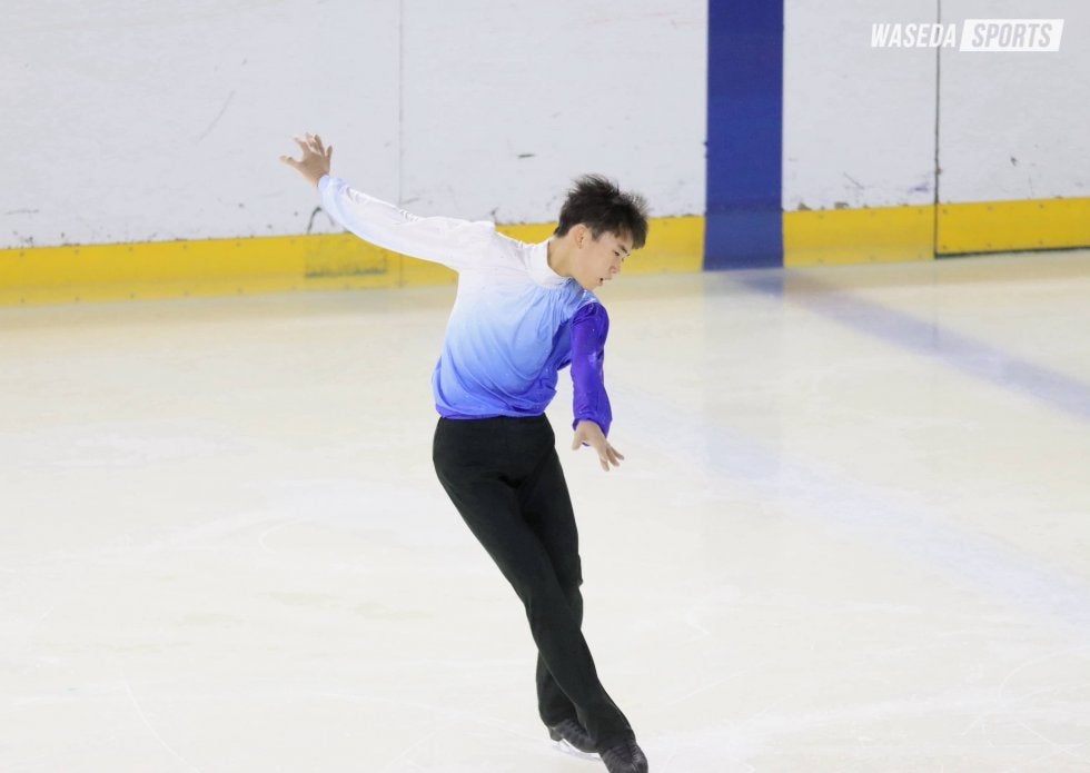 今年の東インカレ、早大フィギュア部門のトップバッターは新入部員の坂﨑愛介(基理1=東京・早大学院)。大学入学を機に競技を再開した坂﨑は、出場予定だった7月の大会を欠場したため、今大会が大学デビュー戦兼復帰戦となった。ブルーのシャツにグレーのベストを合わせた衣装を身にまといリンクに登場し、軽やかに演技をスタートした。冒頭の1回転アクセルから始まり、コンビネーションを含むジャンプを次々と着氷。特に2本目の2回転トーループは「1回も跳べたことがなくて、ぶっつけ本番」だったというが、転倒せずに決めると、リンクサイドで演技を見守っていた主将の岡島右京(商4=東京・早大学院)と同期の山田琉伸(人通1=埼玉栄)から歓声が上がる。『Bones』に合わせて堂々とプログラムを演じ切った。「(大会に)出るだけで嬉しい、楽しいという気持ちが出せた」と語ったように、笑顔が光る演技を披露した坂﨑。疲れが出る終盤でのスピンのミスはあったものの35・71点で1位につけ、大学デビュー戦で見事優勝を飾った。