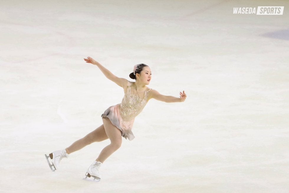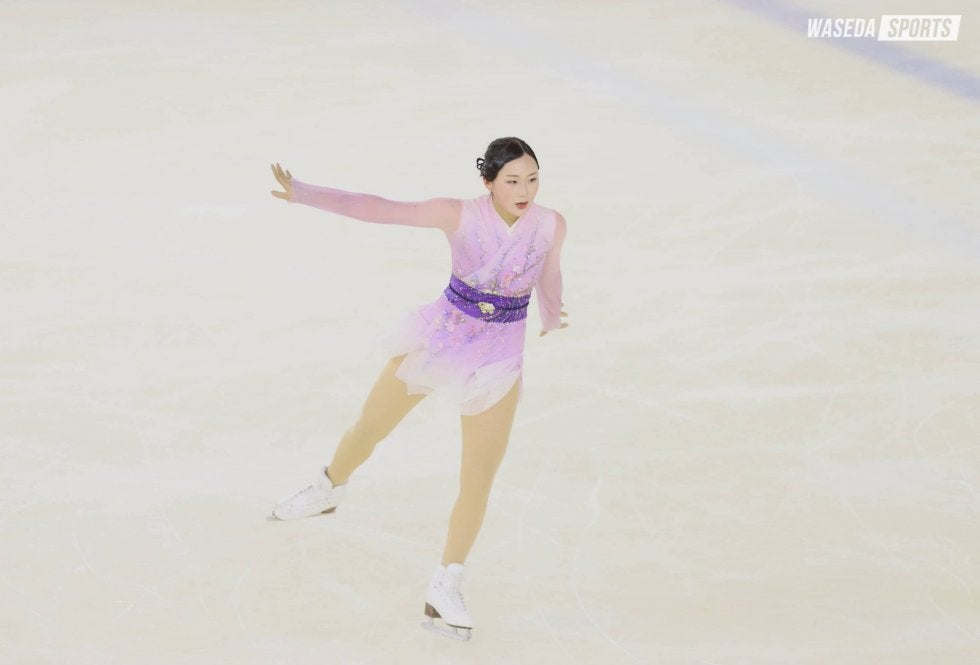最後に行われた女子7・8級の競技には3人が出場。初の東インカレ参戦となった吉本玲(国教1=兵庫・芦屋国際中教校)は、ジャンプを曲の中で決めるために「どうやって気持ちを持っていくか」という点を重視して練習してきたという。東京ブロックで課題を感じたジャンプを決められるかが鍵となっていたが、冒頭の3回転トーループは転倒。その後も3回転ジャンプでのミスが目立ってしまう。それでも疲れが出る最後の2回転アクセルは転倒せずに着氷し、最後まで『ロミオとジュリエット』を演じ切った。「うまく噛み合わない部分があった」と、ジャンプは苦戦気味だった吉本。課題と向き合いながら、東日本選手権に向けて調整を行なっていく。