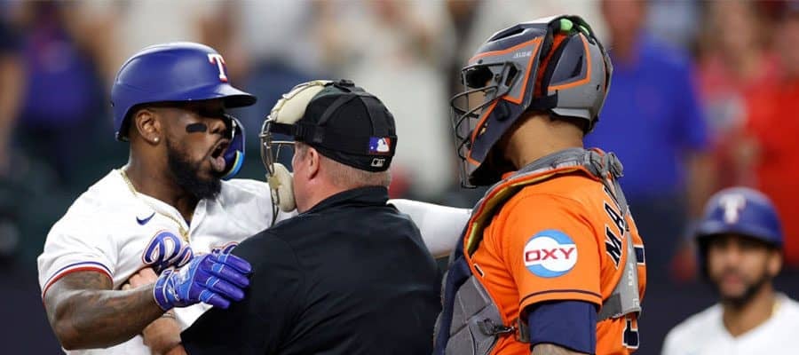 8回無死一塁、前の打席で逆転3ランを放っていたガルシアが死球を受けた■アストロズ 6ー5 レンジャーズ(日本時間21日・…