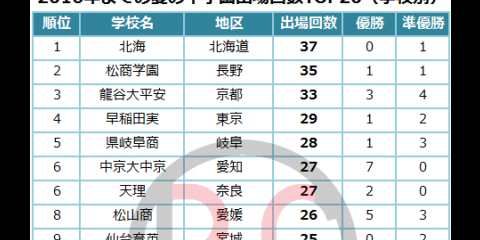 2016年までの段階で、夏の甲子園出場回数の上位TOP20校を発表。