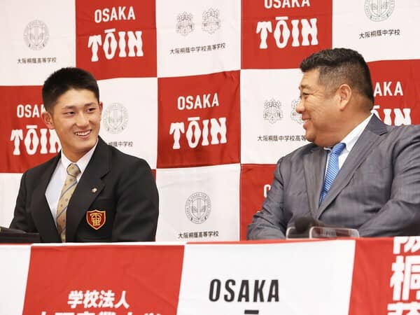DeNAから1位指名を受け、笑顔の松尾汐恩(写真左)と西谷浩一監督