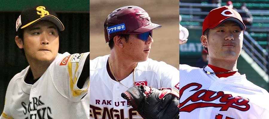 ソフトバンク・高橋純平、楽天・炭谷銀仁朗、広島・岡田明丈(左から)【写真:藤浦一都、荒川祐史】