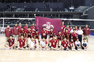 天皇杯ブロックラウンド2戦目、ファイナルラウンド進出をかけた今試合は、V2のつくばユナイテッド Sun GAIA(つくば)と対戦した。1セット目では下級生の活躍も光り、危なげなくセットを取るが、2セット目は終盤まで相手にペースを持っていかれる。それでも粘り強さを見せ追い上げ逆転し、セットカウント2-0(25-17、27-25)で天皇杯ファイナルラウンド進出を決めた。