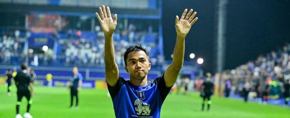 川崎フロンターレのサポーターに挨拶をするパトゥムのチャナティップ 撮影:中地拓也