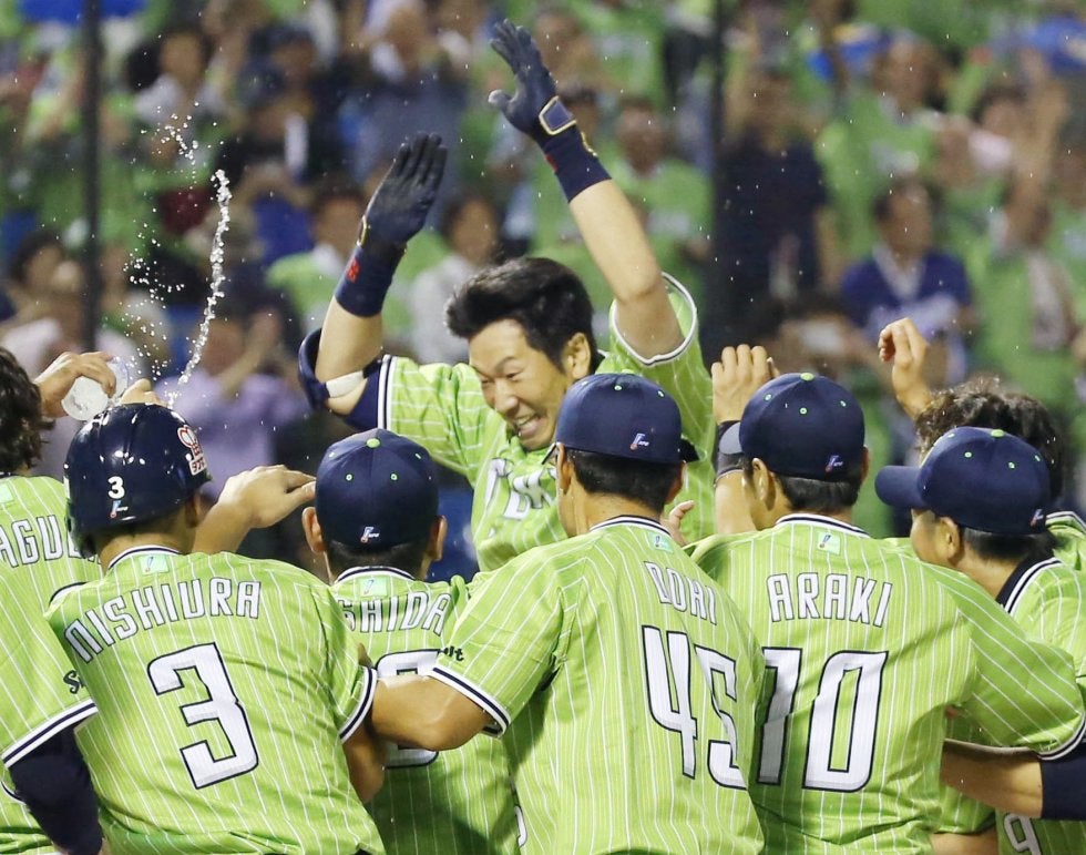 10回、代打でサヨナラ本塁打を放ち、ナインに迎えられるヤクルト・大松(中央)=神宮【写真提供:共同通信社】