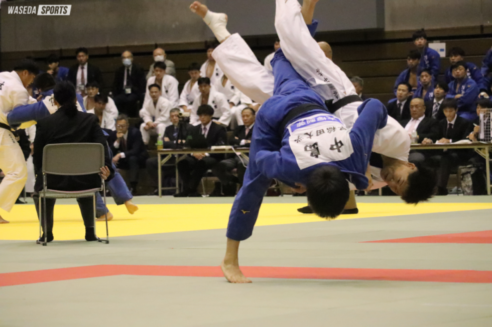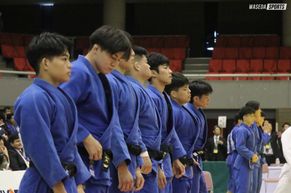 初戦に迎え撃った相手は仙台大。先鋒・工藤大輝(法3=福岡・小倉)が相手から反則を引き出し、一本勝ちを収める。「ここでしっかり取ってくれたおかげでチームにいい流れができた」と道下新大主将(スポ4=東京・国士舘)が語るように、スタートから勢いをつけていく。早大はその後も次鋒・園田陸斗副将(スポ4=熊本・九州学院)、続く中島瑞貴(スポ3=福岡・西日本短大付)が共に内股で一本を勝ち取る。その後も副将・中野智博(スポ3=神奈川・桐蔭学園)は浮落、大将・道下は大内刈をそれぞれ決め、流れをつかみ6-0で快勝した。