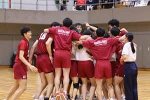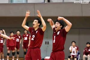 迎えた第3セット、サービスエースとブロックで前に出た日体大に終始リードされる展開が続く。畑のスパイクや麻野のブロック、前田のサービスエースなどでブレイクし追いかけるも、日体大のブロックディフェンスとディグにより点差を詰めることができず20ー25でこのセットを落とした。第4 セットは水町のスパイクからスタート。水町、麻野のサービスエースで6ー2と序盤から試合を優位に進めたように思われたが、日体大はブロックアウトやクイックで得点し9ー10と逆転を許す。競った展開が続く中で、山田が自らブロックでタッチをとりすぐにサイドに開いてスパイクを決め、チームを大きく鼓舞した。日体大も3セット目同様ブロックタッチとディグで早大の攻撃に対応し、お互いに全く引けを取らない状態で終盤に突入した。水町、山田の両サイドのスパイクにより一歩前に出て迎えた24ー23の局面。浅野翼(スポ3=宮城・東北)をサーブで投入し勝負をかけるも、日体大はこれを凌ぎ、次のラリーで逆転する。それに対して早大も代わって入った佐藤遥斗(スポ1=東京・駿台学園)がディグでつなぎ、山田がブロックアウトを取って再び前に出る。山田のスパイクでマッチポイントを握ると、最後は水町がブロックでシャットアウトし勝利を決めた。
