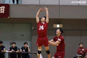 第1セット序盤からMB麻野堅斗(スポ1=京都・東山)やOP畑虎太郎(スポ2=福井工大福井)、さらにOH水町泰杜主将(スポ4=熊本・鎮西)が立て続けに相手のスパイクをシャットアウトし、4連続得点でリードした。相手のバックアタックをストレートに構えていたリベロ荒尾怜音(スポ4=熊本・鎮西)が上げ、後ろからの難しいトスを水町が打ち切りつなぎの強さを発揮。その後セッター前田凌吾(スポ2=大阪・清風)もブロックポイントを生み出し11―7と序盤は早大が先行した。スパイクミスや相手のサービスエースにより一時逆転を許したものの、MB伊藤吏玖副将(スポ4=東京・駿台学園)のサーブ時に前田がさらに2度相手のスパイクをシャットし5連続得点で再び突き放すと、最後は水町がパイプを決め第1セットを取った。