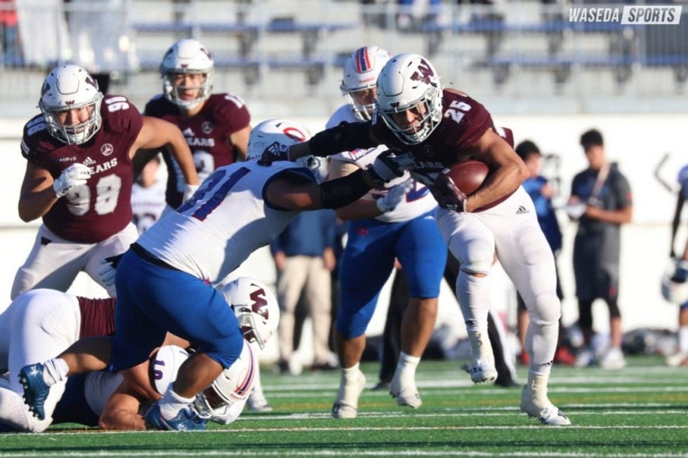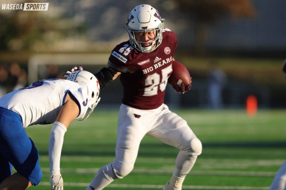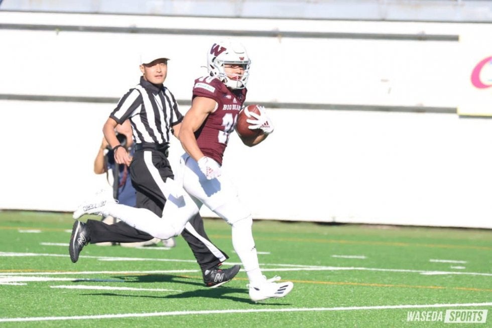 エースRBの本領が発揮された。花宮は昨季、萩原奎樹(令5政経卒)、安村充生副将(文構4=東京・早実)らとともに強力なRB陣を形成。リーグ1位のTD数とリーグ3位の獲得ヤードの好成績を残し、初のオール関東24にも選出された。名実ともに安村と並ぶBIG BEARSのエースRBとなった花宮だったが、今シーズンは試合前までTD0と調子が上がりきらなかった。それでも中大戦では花宮のランがチームの獲得ヤードの約4割を占め、TDも2本生まれるなど復調。チームを勝利に導く大活躍だった。しかし、花宮は試合後「反省の気持ちの方が大きい」と語り、快勝の結果にも満足はしていない。花宮の見据える先は昨季悔しい思いをした甲子園ボウル。日本一への道が続く限り、花宮は貪欲にグラウンドを駆け巡る。