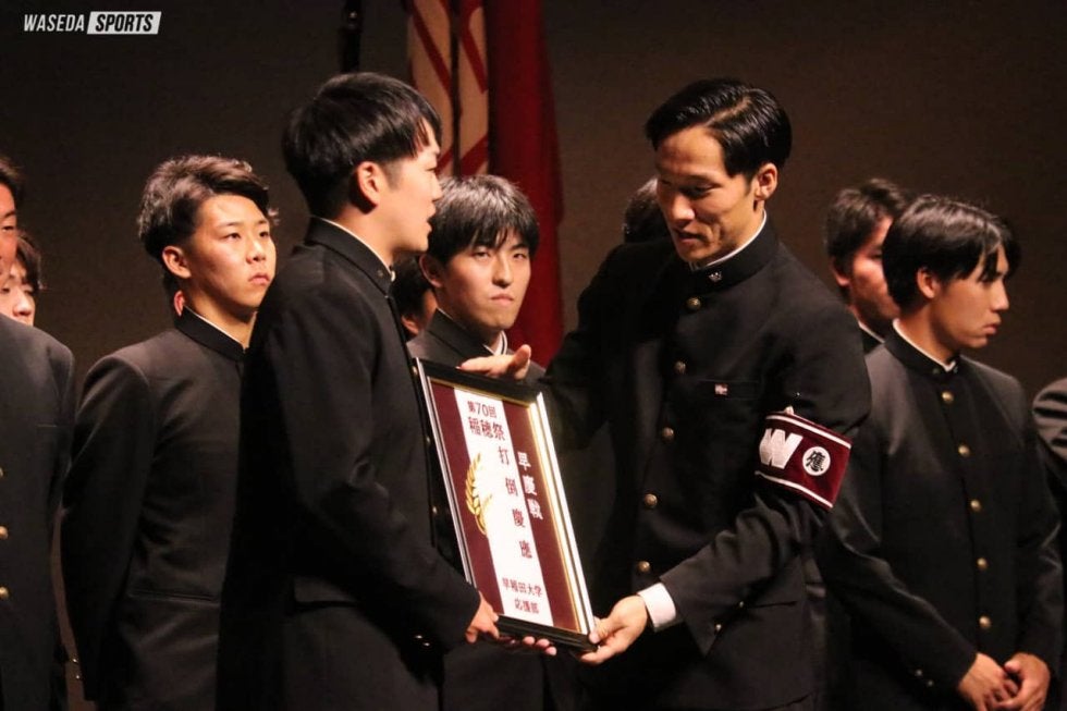 第三部では、野球部壮行会が行われた。野球部・熊田副将が「ともに慶應を倒し優勝の喜びを分かち合いましょう」と早慶戦への意気込みを語ると、永田新代表委員主将(教4=静岡・掛川西)から野球部にペナント、応援部からのメッセージが入ったユニフォーム、フォトモザイクアートを贈呈。「全早稲田と野球部が一体となった思いを早慶戦でよりいっそう近く感じられるように」と永田が熊田をはじめ野球部に熱い思いを込めて、贈呈が行われた。最後は永田を中心として、校歌を三番まで応援部、野球部、観客が愛校心のもと起立、脱帽の上腕を振り続けた。斉唱を終えると、大盛況のもと、第70回稲穂祭は幕を閉じた。