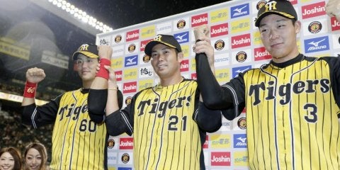 DeNAに勝利し、ポーズをとる阪神の(左から)中谷、岩田、大山=甲子園【写真提供:共同通信社】 阪神の岩田が27日のDe…