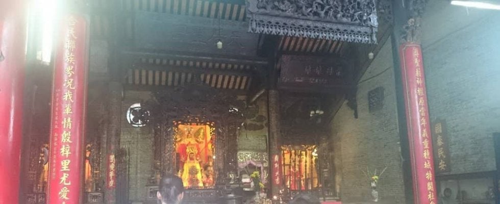 掲載した写真をご覧ください。ベトナム最大の都市、ホーチミン市ショロン地区の仏教寺院で撮った写真です。線香の煙でボヤけていますが、両側の赤い柱に金色の漢字がたくさん書いてあるのがご覧になれるでしょう。