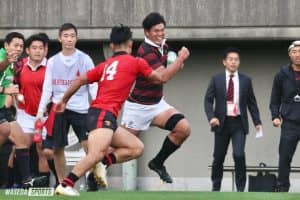 迎えた後半、早大は先制点を献上したものの、9分に敵陣ゴール前ラインアウトを獲得し、モールから速いテンポでFWを当て前進し、ペナルティーを誘う。もう一度ラインアウトを選択し、次はモールで確実にトライを取り切った。続く15分、相手にペナルティーキックを決められ、両校の差は10点に。そして27分、早大は敵陣ラインアウトを獲得すると、FWをひとつ当て逆サイドに展開。パスを受けたHO佐藤健次(スポ3=神奈川・桐蔭学園)がディフェンスを突破し、最後はLO村田陣悟(スポ4=京都成章)がタックルされながらボールを左隅のゴールラインに叩きつけた。3点差となり会場を沸かせた早大であったが、33分、40分と立て続けにトライを奪われ最終スコアは、21ー36。追い上げを見せたが、終盤で離され悔しい敗戦となった。
