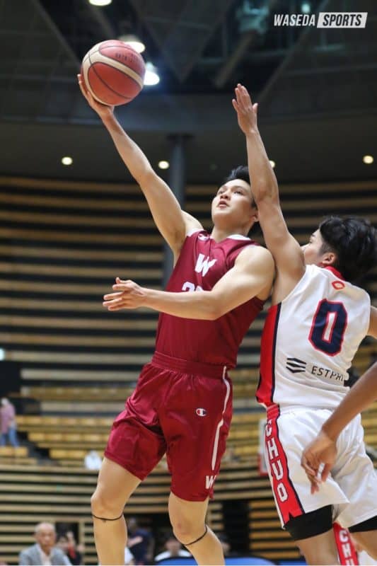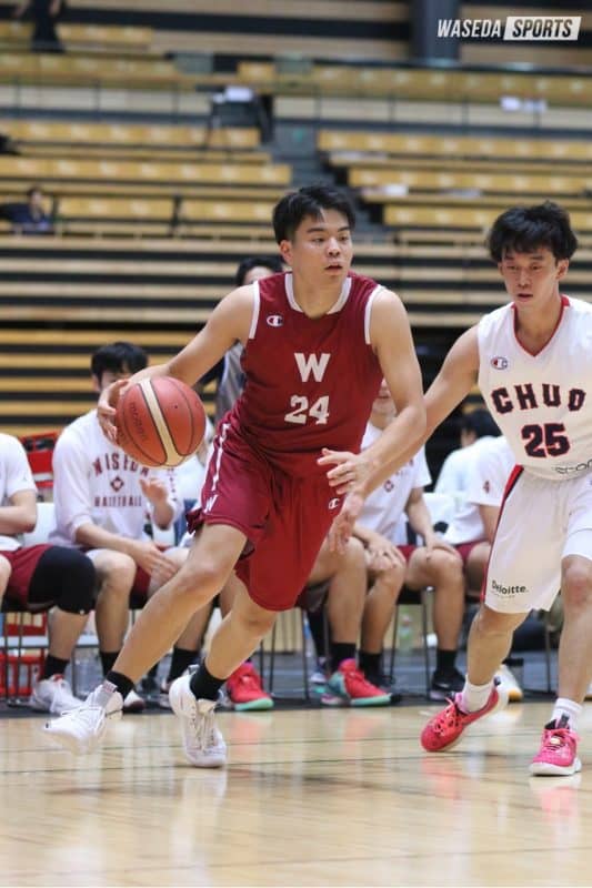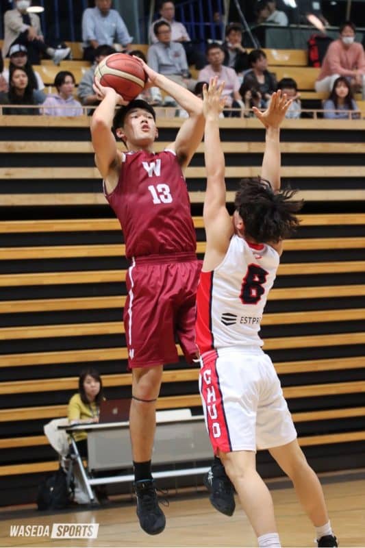 第1Q、F細溪宙大主将(教4=東京・早実)含む上級生中心のスターティングメンバーが出場。開始早々にG石水鴻(スポ2=東京・国学院久我山)がスリーポイントを決める。続けてG飯島慶記(人3=茨城・下妻第一)、細溪が得点し好調な滑り出し。さらにF三浦健一が連続得点し、15-7で早大がリードする。しかし中大が連続スリーポイントを皮切りに追い上げを見せ、第1Q終盤に続けて失点。第1Qを18-19で終えた。第2Q、早大は果敢にゴールへ向かうもシュートを決めきれず、得点が停滞する。一方流れをつかんだ中大が得点を重ね、点差は10点以上に。第2Q終盤、G下山瑛司(スポ1=愛知・中部第一)のスリーポイント、G岩屋頼(スポ2=京都・洛南)の速攻で食い下がり、32-43で試合を折り返した。