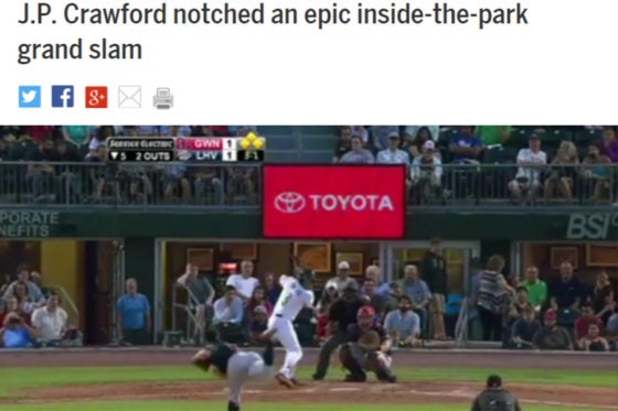 “頭脳的”な走塁から生まれた「珍ランニングホームラン」。MLB公式サイトの動画コーナー「Cut4」も「J・P・クロフォードがとても印象的なインサイド・パーク・グランドスラムを放つ」と特集。一連のプレーを説明した上で「結果はランニング満塁ホームランだ。信じられないだろ?」と伝えた。