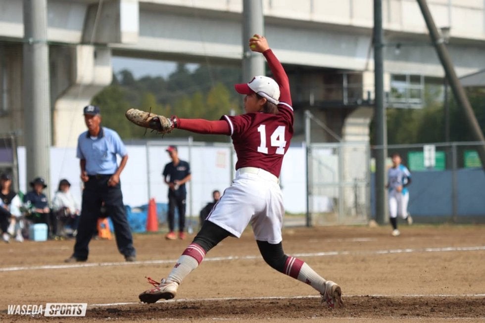 逆転した直後の5回裏の守備、9番に安打を許すと、2死から2番に左中間を破られる同点の適時打を浴びる。さらに6回、無死で4番に四球で出塁を許すと、5番の安打、6番の犠打で1死二、三塁のピンチを招く。続く7番の打球は二塁手・河井なごみ(スポ3=埼玉・伊奈学園総合)へのゴロとなり、河井は本塁へ送球する。しかし本塁生還を試みたこのプレーはセーフに。これで勝ち越しを許すと、8番の犠飛、9番の適時打で3点のビハインドと苦しい展開となった。
