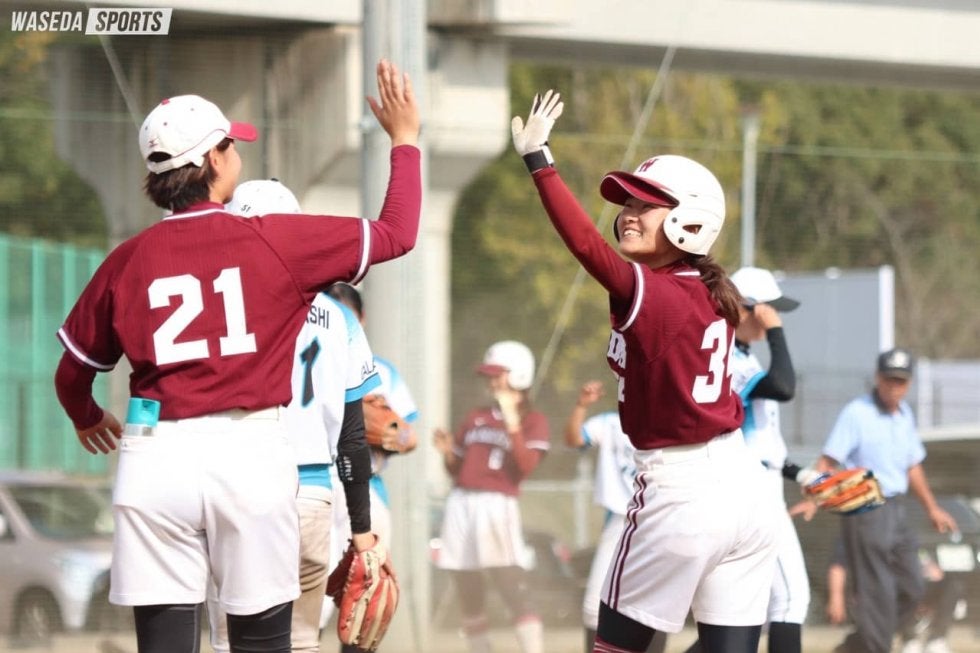 5回に適時打を打ちハイタッチする瀧之上(写真右)と高美優(スポ4=福岡中央)