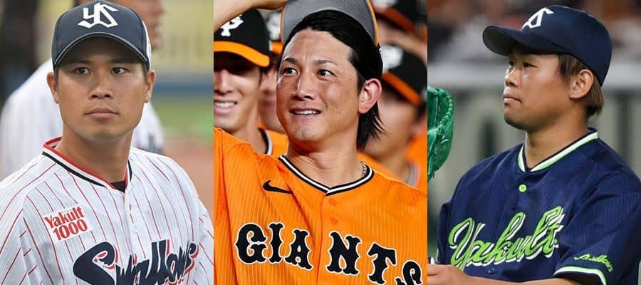 巨人・小林誠司、ヤクルト・田口麗斗、現役引退を表明した奥村展征(左から)【写真:矢口亨、小林靖】