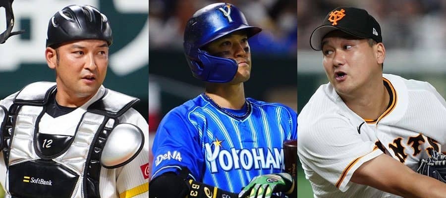 ソフトバンク・嶺井博希、DeNA・関根大気、巨人から戦力外となった三上朋也(左から)【写真:荒川祐史、矢口亨】