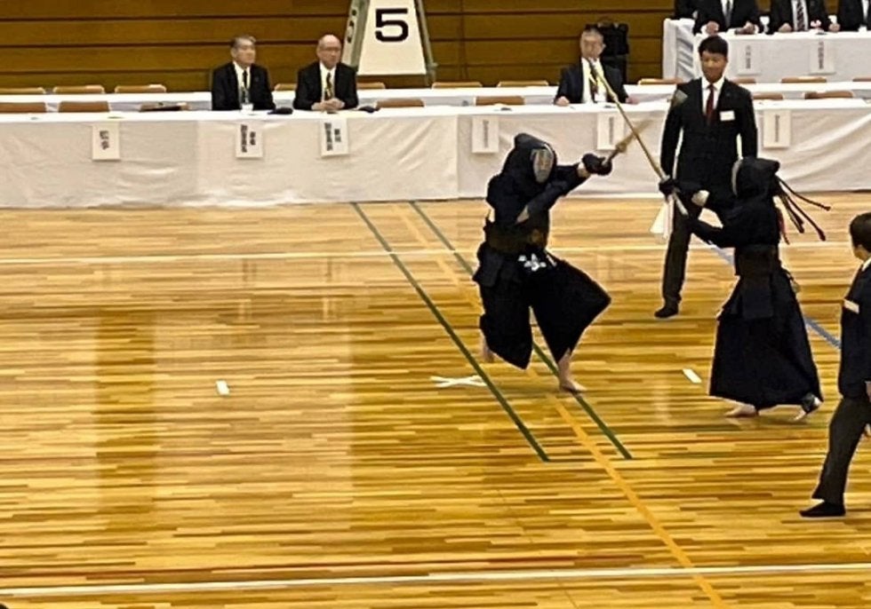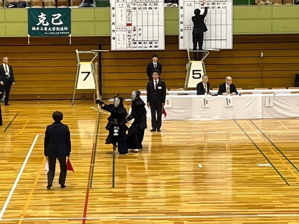 次鋒は栗山一花(社3=大分国際情報)。関東大会では後ろのポジションが多かったが、今大会では次鋒での出場となった。試合開始数秒で、栗山がコテを打ったところに、栗山のメンの先を取ろうとして相手がドウを打ってきた上からメンを決めて一本。試合3分ごろには、相手がコテを打ってきたところに引きメンを放ち二本目を奪った。