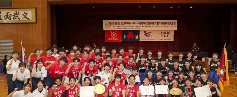 全日本バレーボール高等学校選手権大会の千葉県大会で男子・女子ともに優勝し、記念撮影をする習志野の選手たち=5日、同県成田市(酒井真大撮影)