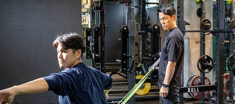用意されたメニューを、テンポ良くこなしていく鍵谷。白水コーチいわく、「『この部位に力を入れて』と説明すると、やってほしい形がパッとできるタイプ」だという。メニューの大半はこの日初めて取り組むものだったというが、それでもひと言、ふた言の説明で滞りなくこなしていく様子は驚きだった。