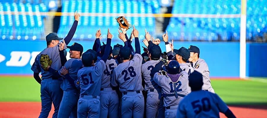 試合は7回まで無得点が続く投手戦も、ワンチャンスをものにした。8回に相手の連続失策で1死一、二塁の好機を作ると、阪神ドラフト1位の下村海翔投手(4年)が2者連続四球の押し出しで先制に成功。さらにソフトバンク3位の廣瀬隆太内野手(4年)が、広島1位の常廣羽也斗投手(4年)から右犠飛を放ち追加点を奪った。