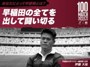 早慶スポーツ新聞会コラボ企画もいよいよ最終章。早大側の最終回を飾るのは、伊藤大祐主将(スポ4=神奈川・桐蔭学園)だ。ラグビー早慶戦まであと2日に迫る中、100回目の節目の試合に挑む主将の心境とは。チームの成長やご自身の主将としての在り方について変化も伺った。