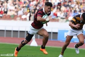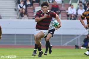 伊藤大祐さん(FB伊藤大祐主将、スポ4=神奈川・桐蔭学園)がマークしていて、で大祐さんからタップして来るのではと予想していて、そこについていけたので良かったのかなと思います。最近、自分はランニングに力を入れているので、それが出たシーンだったと思います。そこで前の僕だったら、相手にコンタクトしてそこで一個のラックを作ってしまっていたところを、由高(WTB矢崎由高、スポ1=神奈川・桐蔭学園)が来るのを待つ余裕を作れるようになったのは、自分の中での成長ポイントだと思います。
