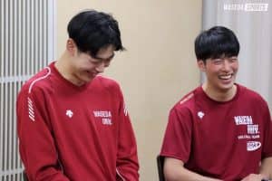 第2回は、早稲田の守備を支える下級生4人。MB板垣慧(政経2=京都・洛南)と麻野堅斗(スポ1=京都・東山)、菅原啓(教1=山形南)、リベロ布台聖(スポ1=東京・駿台学園)に今年の振り返りや全日本インカレに向けた意気込みを伺った。