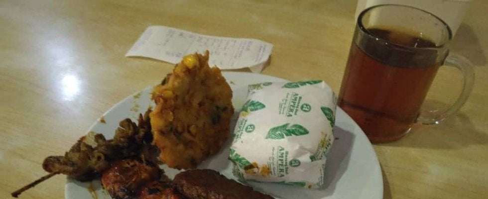 スンダ料理。右上の紙包みにご飯がぎっしり入っている。お茶はサービス 提供/後藤健生