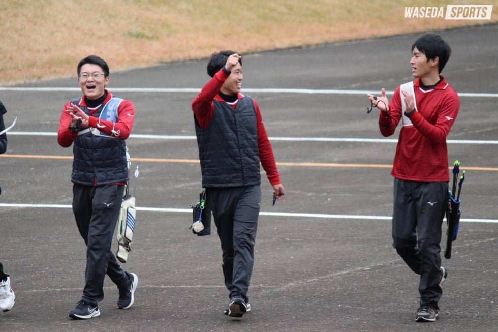 男子70mラウンドは柿沼大翔(教4=東京・早大学院)、井上空(創理4=東京・早大学院)、下村謙史朗(人4=東京・暁星)、山下健友男子主将(スポ3=愛知・東海)、丸尾風瑛(スポ2=福岡・柏陵)、安達由樹(人2=茨城・下妻一)、桑原駿(スポ2=愛知・東海)、梅澤徹太(政経1=東京・攻玉社)の8名が出場。梅澤は大学からアーチェリーを始めたにも関わらず、早大男子内で2番目に高い566点を記録。未経験の1年生は70m先の的に矢を届かせることも難しいと言われる中、この結果は驚くべきものだ。丸尾、山下主将を中心に後半にかけて点を伸ばしたが、慶大は8名中5名が600点を超える磐石な強さを見せつけ、寄せ付けなかった。結果300点ほどの差をつけられ、男子70mラウンドは慶大に軍配が上がった。70mラウンドは男女同時に行われたが、「最初から最後まで楽しい雰囲気でできた」と渋谷が振り返ったように、声掛けや点数コールなど、早大らしい明るさが各所で見られ、男女一体となって戦った。また最終エンドは両校が互いに応援し合うなど、早慶戦らしい交流も見られた。
