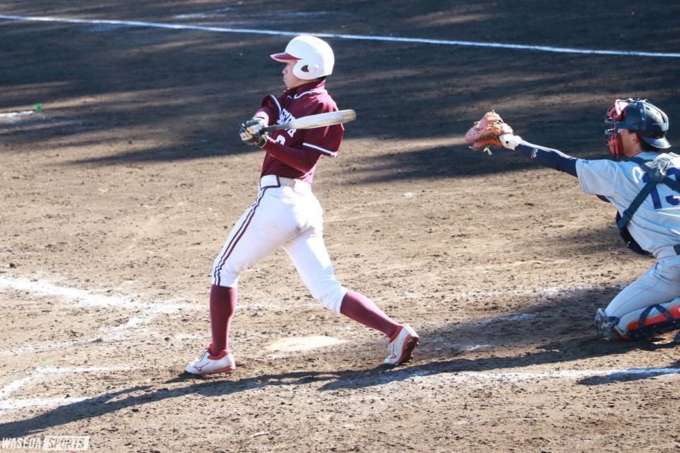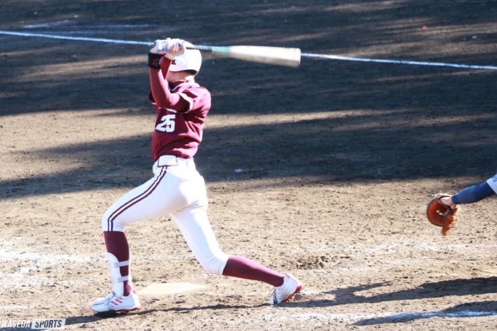 先発した稲垣拓朗(スポ3=群馬・新島学園)は2イニング・打者6人を相手に5奪三振を奪い完全投球。完璧な投球で後続に託した。そして、2回裏、併殺打の間に1点を挙げると早大打線が爆発。続く3回先頭の畠山陸主将(スポ3=高知西)が三塁打を放つと死球で走者をため、この回から代打で登場した加藤雅隆(先理1=愛知・名古屋)が適時打を放ち追加点を挙げる。2死ののち、田中宏が左翼線に強烈な打球を放つ。相手外野手が追いついたころには打者走者含め、全員が生還する3点ランニング本塁打となった。