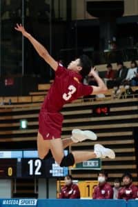 続くセットは、序盤から4年生の活躍が光った。MB伊藤吏玖副将(スポ4=東京・駿台学園)のクイックや山田のバックアタック、水町のサービスエースで一気に流れをつかむ。セッター前田凌吾(スポ2=大阪・清風)と麻野のブロックポイントで9-3とし、タイムアウトを取らせた。その後、早大のスパイクミスでブレイクされることはありながらも、主導権は一切渡さず着実にサイドアウトを取る。リベロ荒尾怜音(スポ4=熊本・鎮西)の二段トスから、水町がスパイクを打ち込み13-6。終盤にかけては、ブロックで相次いでブレイクし、最後は麻野の足の長いクイックでセットを奪った。