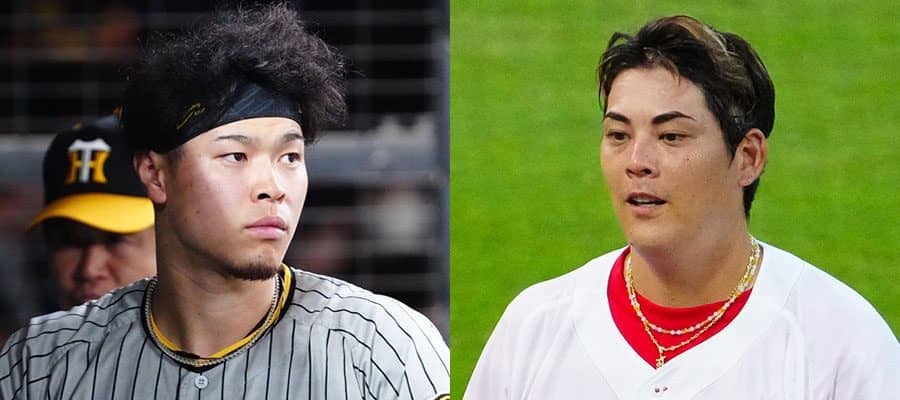 阪神・佐藤輝明(左)と広島・九里亜蓮【写真:荒川祐史】