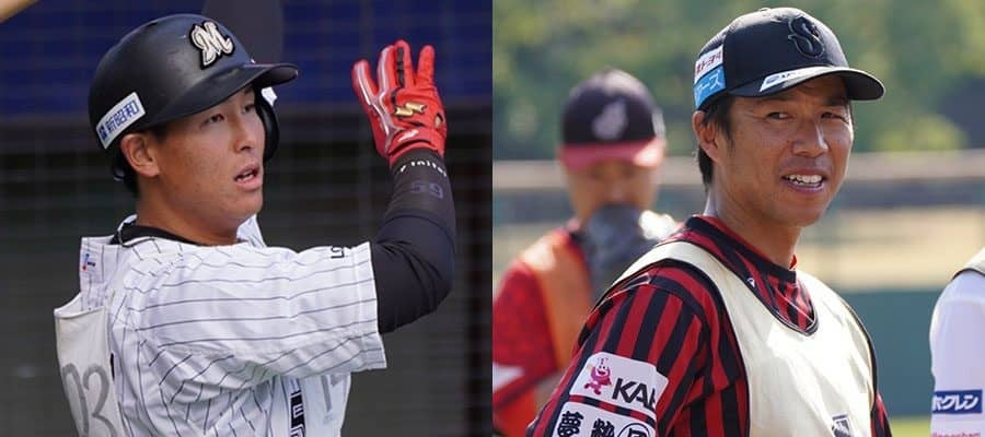 ハヤテ223に入団する西川僚祐(左)と藤岡好明【写真:宮脇広久】