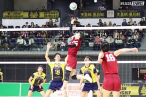 立ち上がりから相手に押し込まれる展開になり、4-9と一時は5点差をつけられてしまう。それでもOH水町泰杜主将(スポ3=熊本・鎮西)の強烈なクロススパイクを皮切りに、徐々に調子を取り戻した早大は、4連続ブレイクでついに逆転に成功する。その間、布台駿(社4=東京・早実)のブロックフォローが良い形の攻撃につながった。その後もMB麻野堅斗(スポ1=京都・東山)のダイレクトやMB伊藤吏玖(スポ3=東京・駿台学園)のクイックなどで着実に得点を重ねていく。佐藤遥斗(スポ1=東京・駿台学園)と伊藤のブロックでマッチポイントになるが、交代時のミスもあり1点が取りきれずデュースにもつれ込む。一進一退の攻防が続く中、水町がエースの意地を見せ28-28。相手のスパイクアウトで29-28になると、最後はOP畑虎太郎(スポ2=福井工大福井)のブロックポイントで第1セットを制した。