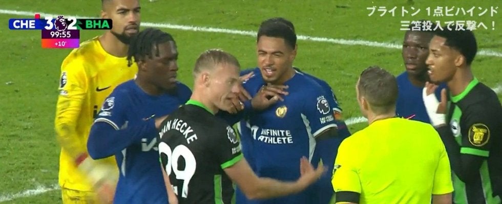 チェルシーが3-2とリードして迎えた90+10分、ブライトンのクロスをDFリーヴァイ・コルウィルが防いだかと思われたが、腕を上げた状態での対応だったため、主審はハンドと判定。土壇場でブライトンにPKが与えられた。