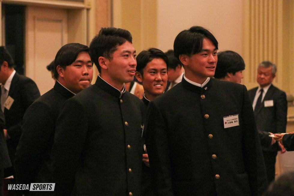 その後は参加者の歓談の時間が設けられ、各参加者は旧友との再会や世代を越えた交流を楽しんだ。また、明大準硬式野球部OBで10月のプロ野球ドラフト会議でオリックス・バファローズから5位指名を受けた高島泰都(令4明大卒=現王子)の紹介が行われ、高島は準硬式野球界を代表してNPBに挑戦する決意を示した。そして、最後は早大の久保嶋真也新主将(社3=神奈川・桐蔭学園)が学生を代表して挨拶を行い、今後の東京六大学連盟の発展に向けた思いを新たにした。