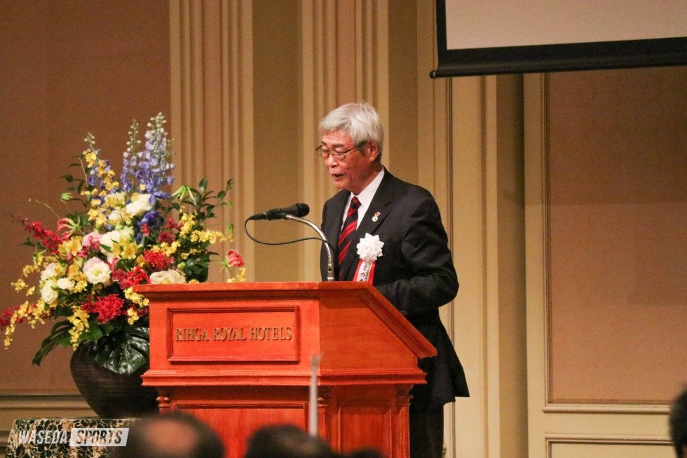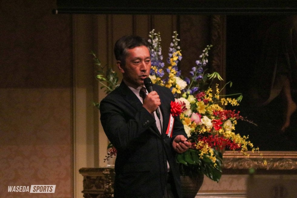 本式典は早大準硬式野球部OBの山口喜久一郎氏(テレビ西日本アナウンサー、平10人卒=香川・土庄)の司会で進行した。初めに東京六大学連盟理事長の大橋弘隆氏の開会挨拶、東京六大学連盟会長で弊会前会長の宮内孝知氏(昭43教卒)の主催者挨拶などが行われ、大橋理事長より東京六大学連盟の「これまで」と「現状」、そして「これから」についての発言があった。