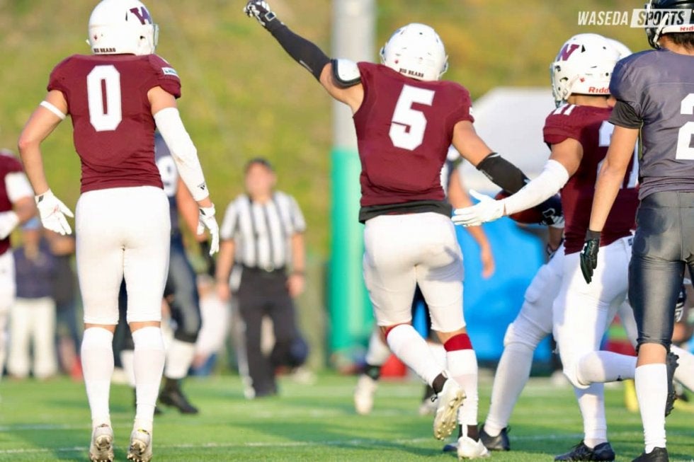 後半に入っても、早大は攻撃の手を緩めない。RB安藤のラン、QB船橋怜(政経2=東京・早大学院)からWR江野彩雅(創理3=神奈川・川和)やWR中原秀城(スポ2=愛知・南山)へのパスで攻め込むも、ここは得点にはつながらず。しかし、第3Q終盤に早大が攻撃権を得ると、WR小鮒晴(文3=神奈川・鎌倉)やRB長内一航(文構1=東京・早実)のランでレッドゾーンに侵入。最後はRB安藤がTDを決め、点差を24点まで広げた。早大の勝利が堅くなったかに見えたが、京大の前半とは打って変わったパス中心の攻撃に大苦戦。2本のTDを奪われた一方、早大はKRのリターナーであるDB堀口拓馬(法3=東京・早大学院)のナイスリターンによって獲得したレッドゾーンからの攻撃を得点につなげられない。その後のKRでオンサイドキックを決められるも、すぐにDB鈴木晴貴(基理3=神奈川・鎌倉学園)がインターセプトを決めてターンオーバー。しかし、京大の堅い守備を早大が突破できず、京大のオフェンスに。このドライブもTDまで持っていかれ、3点差まで詰められる。京大は再び勝負のオンサイドキックを蹴るが、今度は早大がしっかり抑え、そのまま試合終了。早大が31-28で勝利した。
