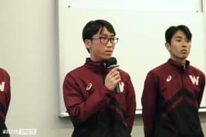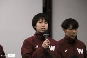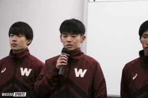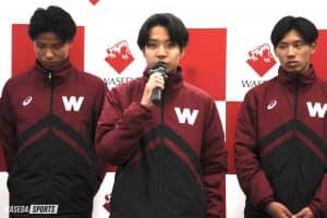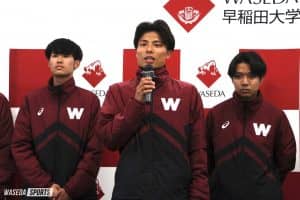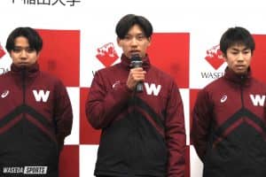 続いて行われた共通取材では、花田勝彦駅伝監督(平6人卒=滋賀・彦根東)から今季の振り返りと、箱根にむけた意気込みが述べられた。続いて、エントリーメンバー16人がそれぞれ意気込みを述べ、菖蒲敦司駅伝主将(スポ4=山口・西京)は「4年間で一番良い(状態)」。箱根路に向け、心身両面の充実をうかがわせた。
