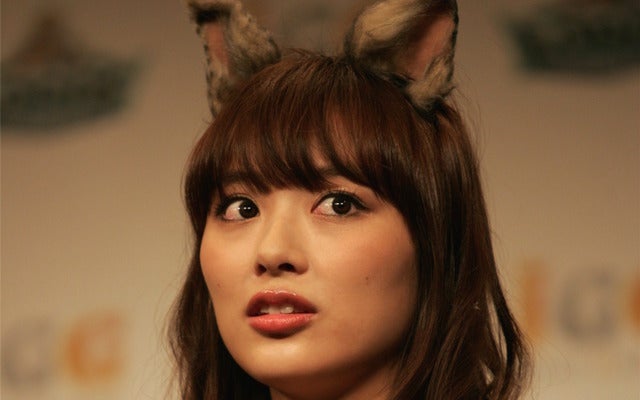 デスハンター・リア役のコスプレでCMに出演した内田理央撮影=山口和幸